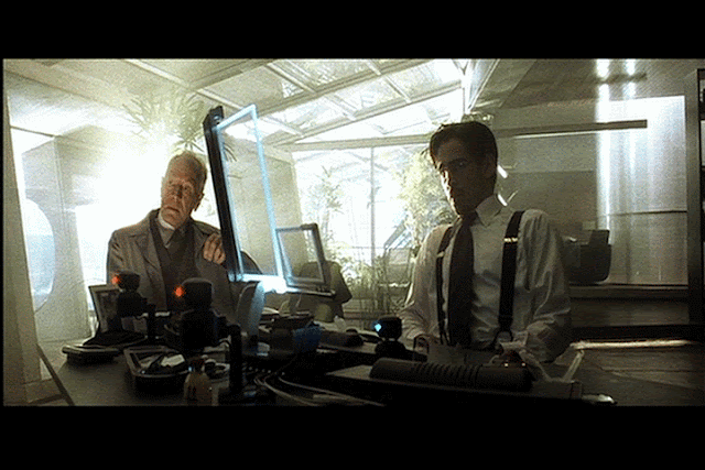 Another interesting observation is that the background behind Burgess (the left side) is all curved and slanted. Throughout the movie, Spielberg uses circles or round objects to suggest secret or illegal activity, such as murder. For example, the "murder predicting machine" shown in the beginning of the film turns a cubic wooden block into a sphere when a murder is committed. Conversely, on Witwer's side of the room (the right side), everything is perfectly straight and rectangular in the background, or in other words, there are only 90 degree angles, suggesting that he goes by the rules and has nothing to hide.